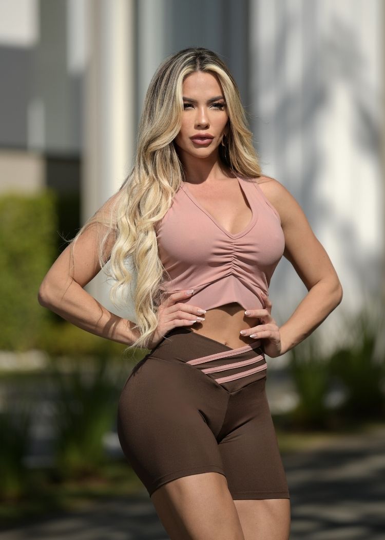 Conjunto Fitness Top Adriana Nude e Short Marrom