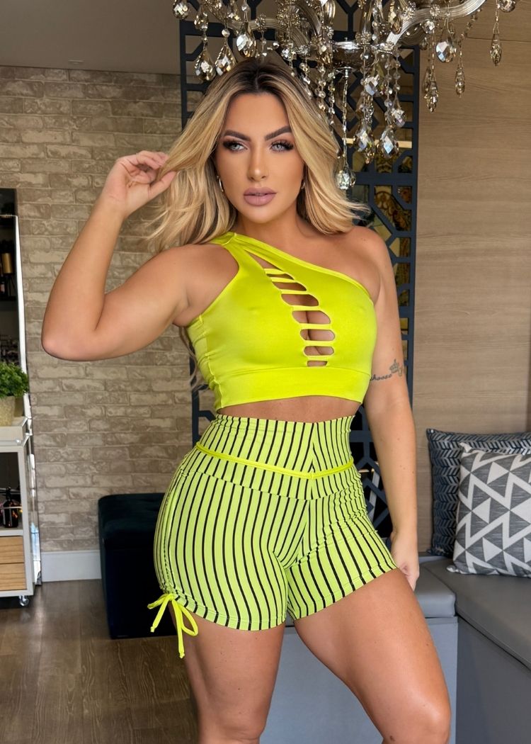 Conjunto Fitness Top Amarelo Neon com Tiras Short Listrado Empina Bumbum Zero Transparência