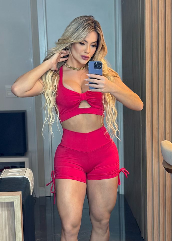 Conjunto Fitness Top com Short Brocado Vermelho Empina Bumbum Zero Transparência