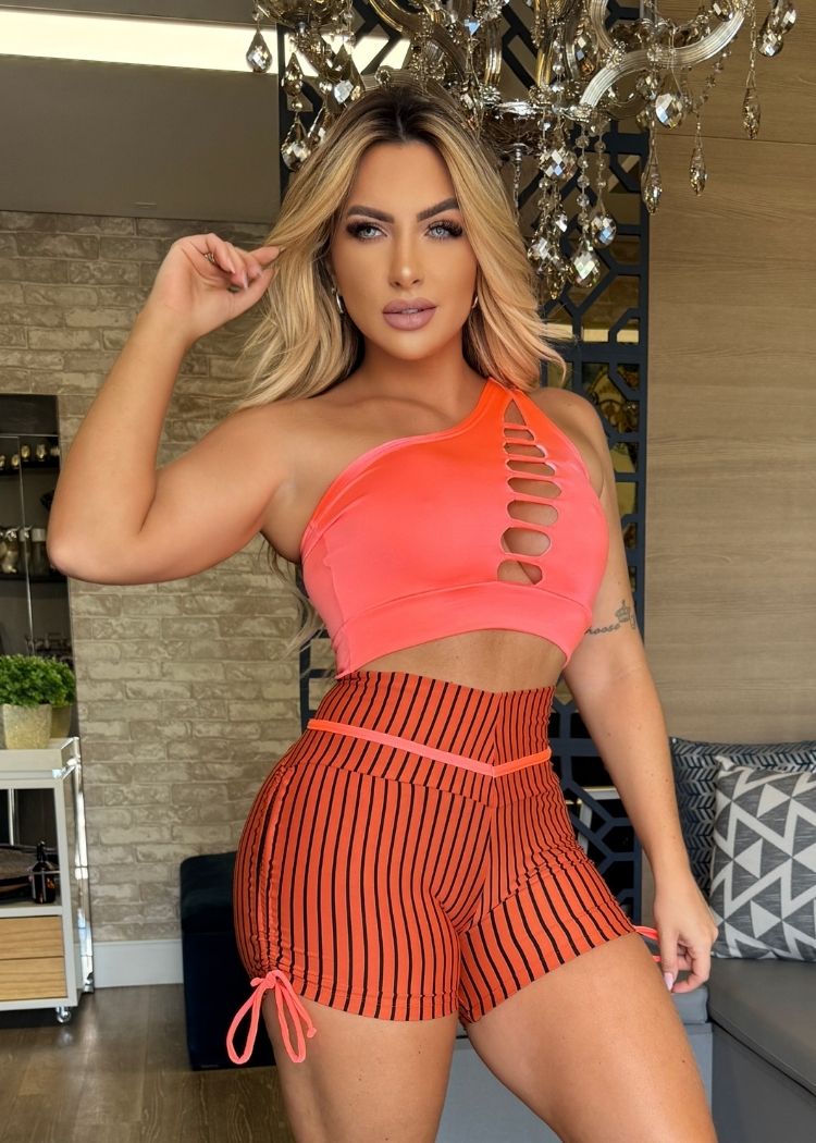 Conjunto Fitness Top Coral Neon com Tiras Short Terracota Listrado Empina Bumbum Zero Transparência