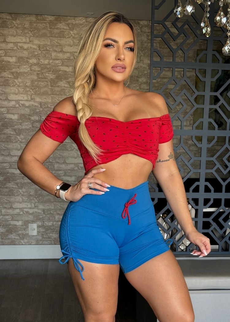 Conjunto Fitness Top Manguinha Melancia Short Azul com Laço Empina Bumbum Zero Transparência