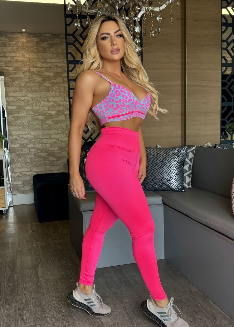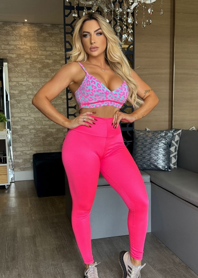 Conjunto Fitness Top Oncinha Lilás com Decote Legging Pink Empina Bumbum Zero Transparência