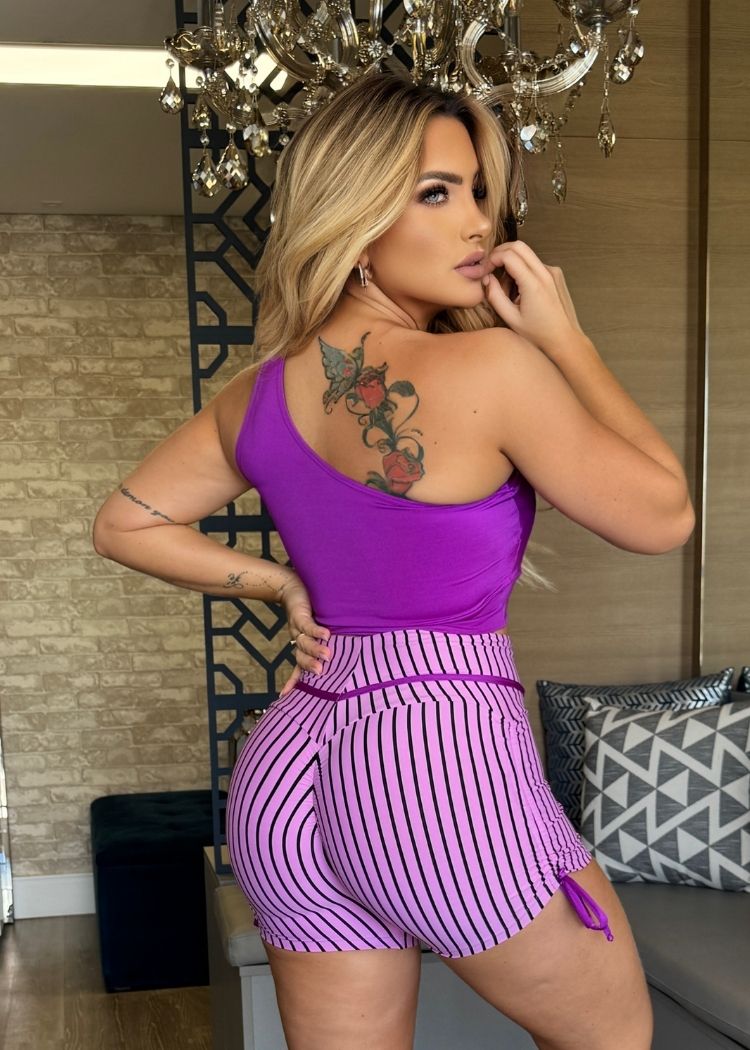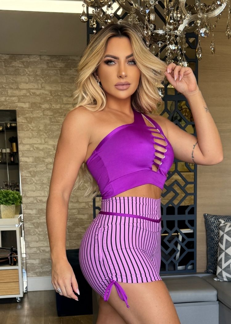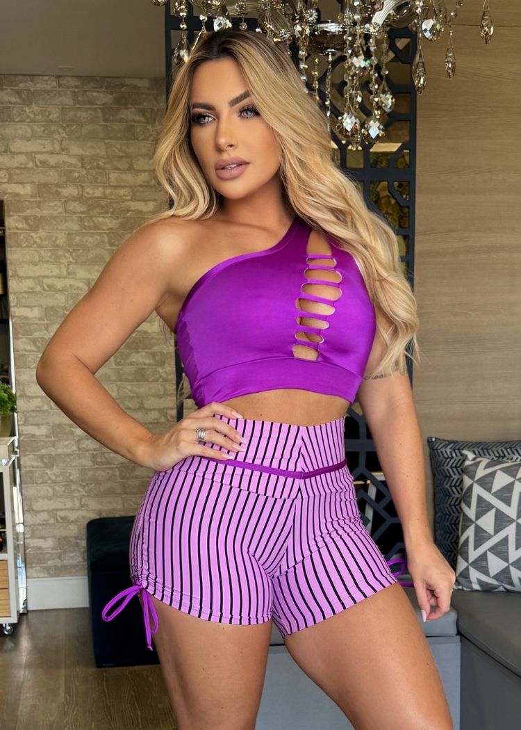 Conjunto Fitness Top Roxo com Tiras Short Lilás Listrado Bumbum Zero Transparência
