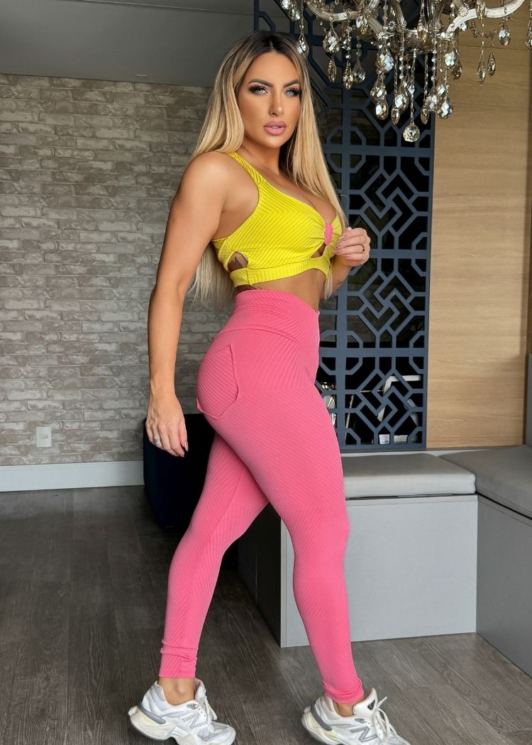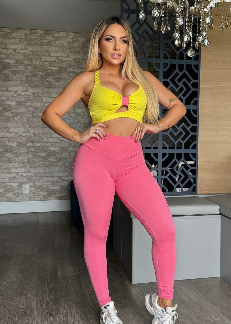 Conjunto Fitness Zigzag Top Amarelo com Decote Legging Rosa Empina Bumbum Zero Transparência