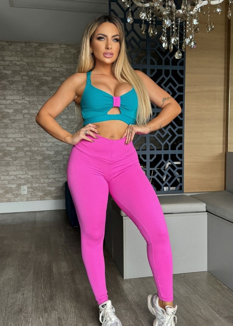 Conjunto Fitness Zigzag Top Azul com Decote Legging Lilás Empina Bumbum Zero Transparência