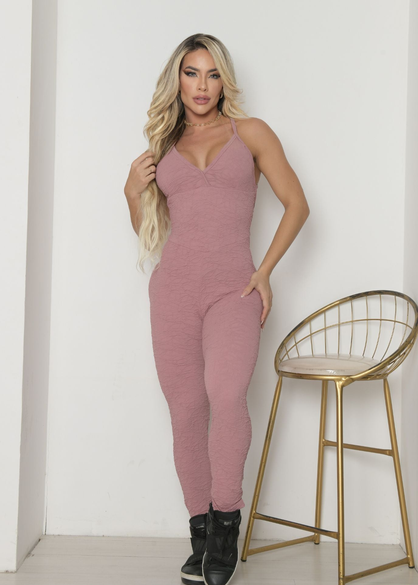Macacão Fitness Alto-Relevo Rosé com Decote Empina Bumbum