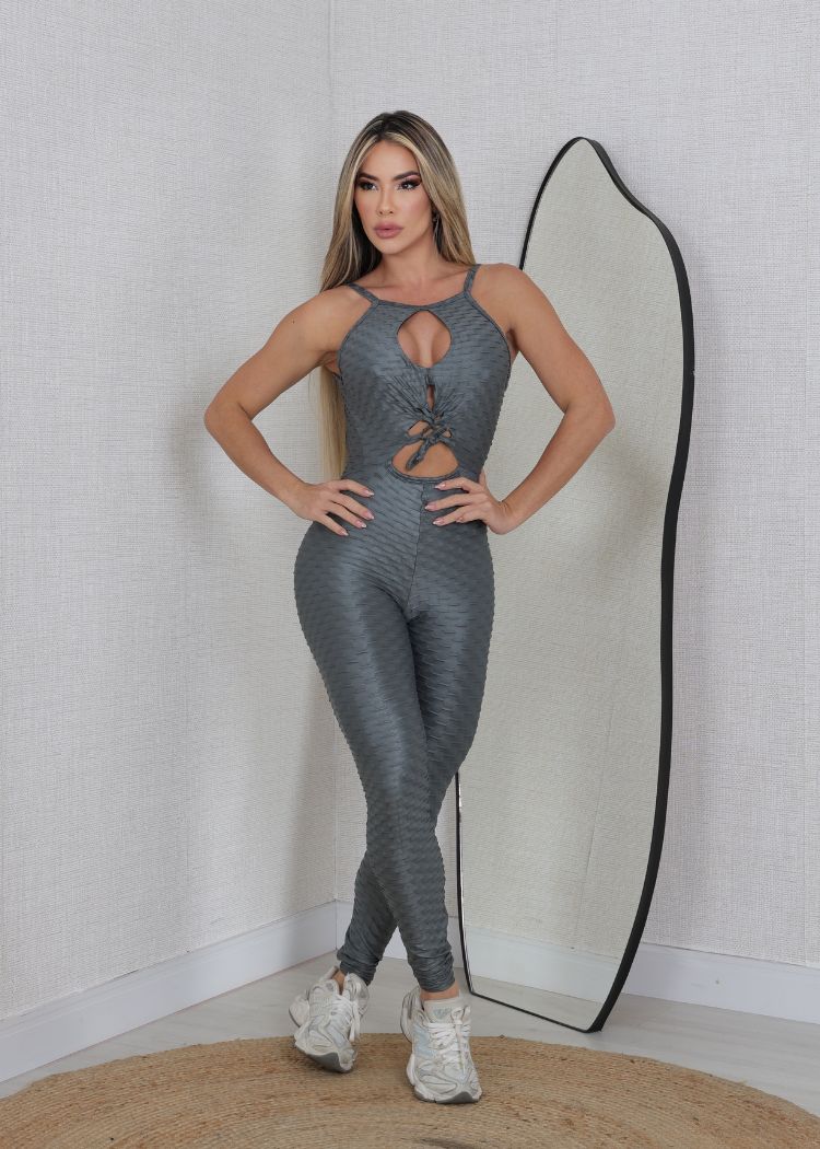 Macacão Fitness Cordinha Brocado Chumbo Zero Transparência
