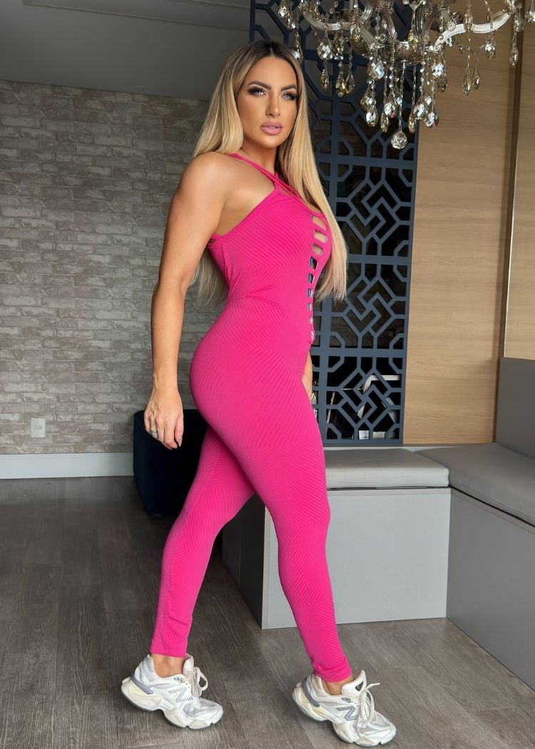 Macacão Fitness Zigzag Rosa com Tiras Empina Bumbum Zero Transparência