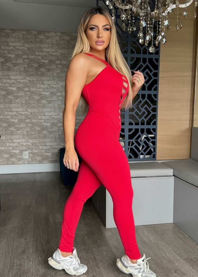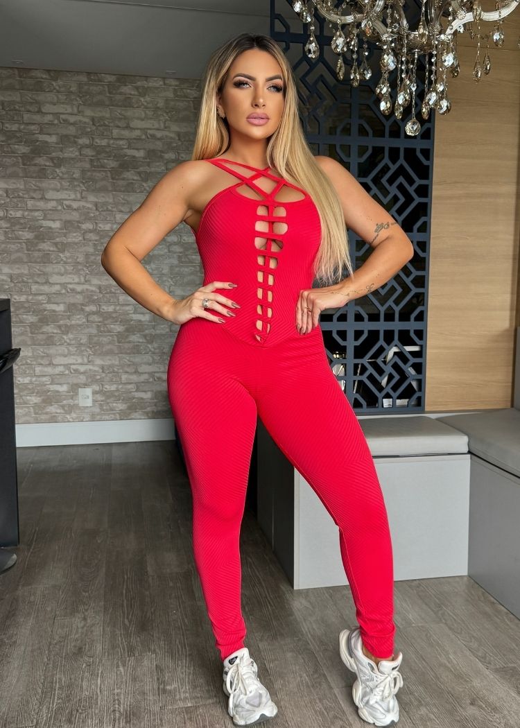 Macacão Fitness Zigzag Vermelho com Tiras Empina Bumbum Zero Transparência