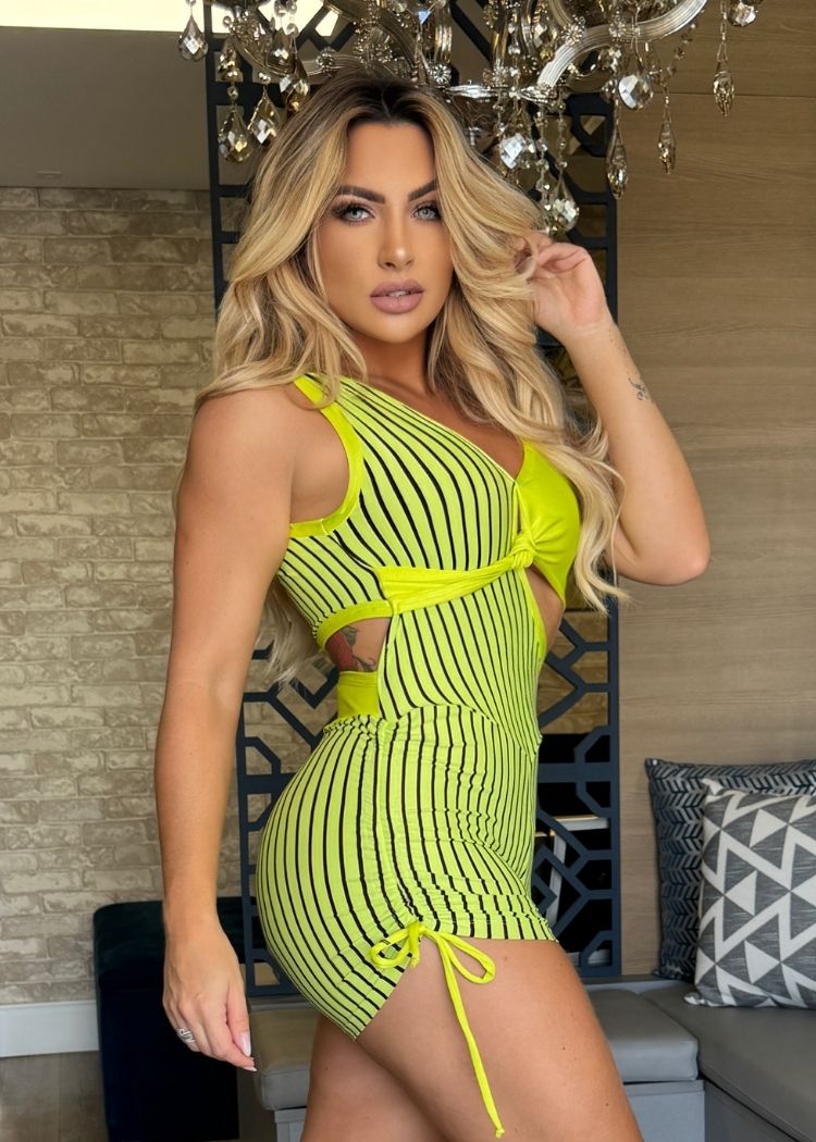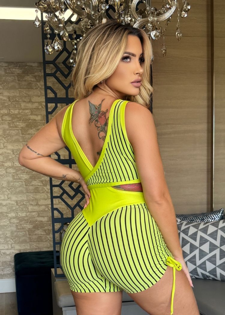 Macaquinho Fitness Amarelo Neon Listrado com Decote Aberto Empina Bumbum Zero Transparência