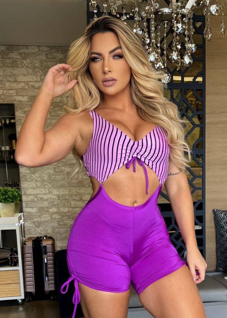 Macaquinho Fitness Lilás e Roxo Listrado com Decote Aberto Empina Bumbum Zero Transparência