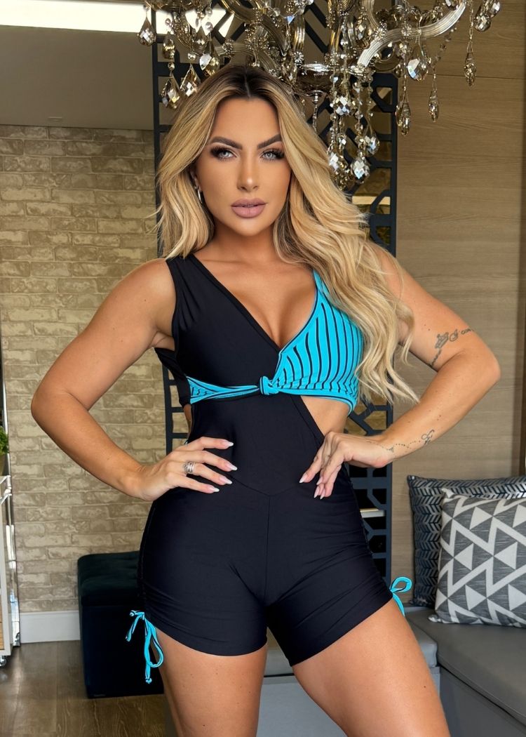 Macaquinho Fitness Preto e Azul Listrado com Decote Aberto Empina Bumbum Zero Transparência