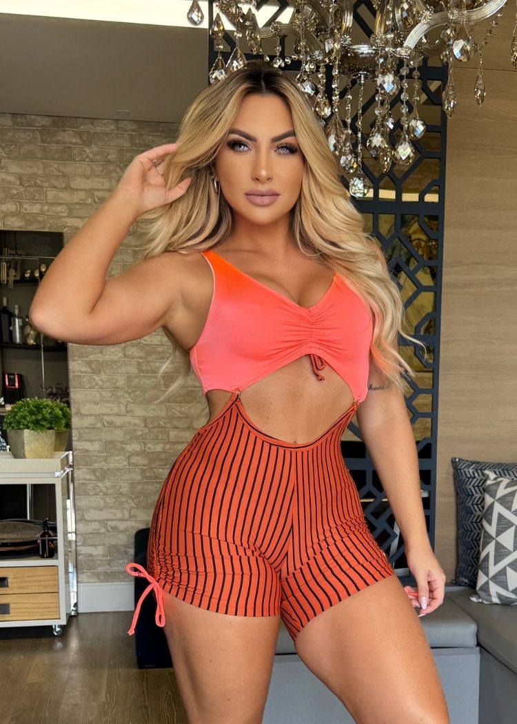 Macaquinho Fitness Rosa e Terracota Listrado com Decote Aberto Empina Bumbum Zero Transparência