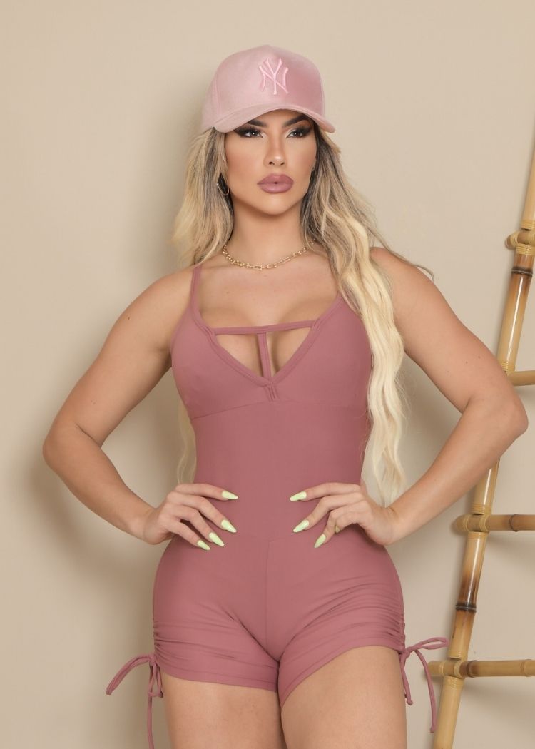 Macaquinho Fitness Viés Rosé com Decote Empina Bumbum
